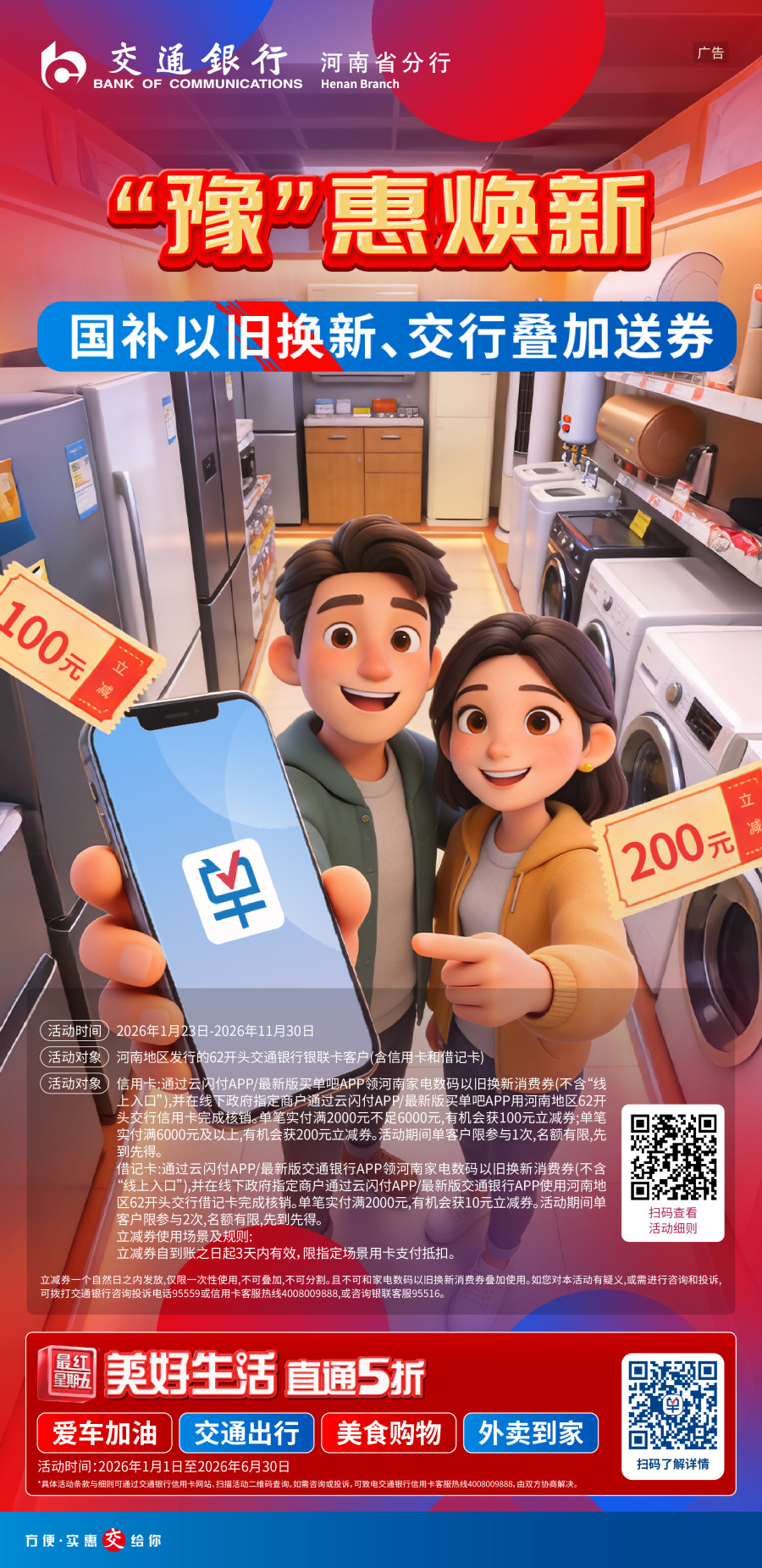 2026年1月23日至 11月30日,河南省分行开展了“国补‘豫’惠焕新、交行叠加送券”活动,积极响应国家消费品以旧换新行动。在政府补贴基础上,对河南地区62开头的交行银联信用卡或借记卡持卡人购买政府指定智能家电、数码产品额外赠送10~200元消费券,推动消费升级与绿色发展。