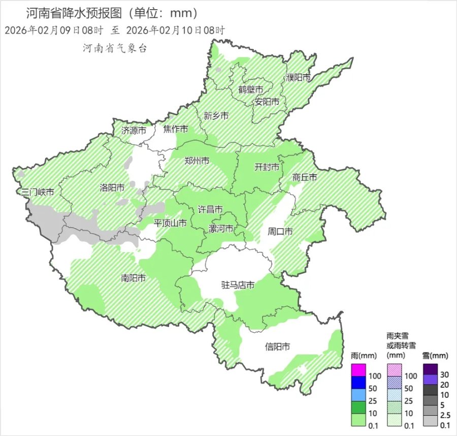 9日,全省阴天,西部、北中部有小雨或雨夹雪,其中西部、西北部高海拔山区有小雪。