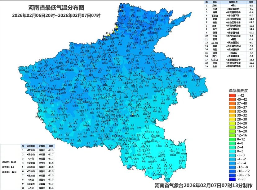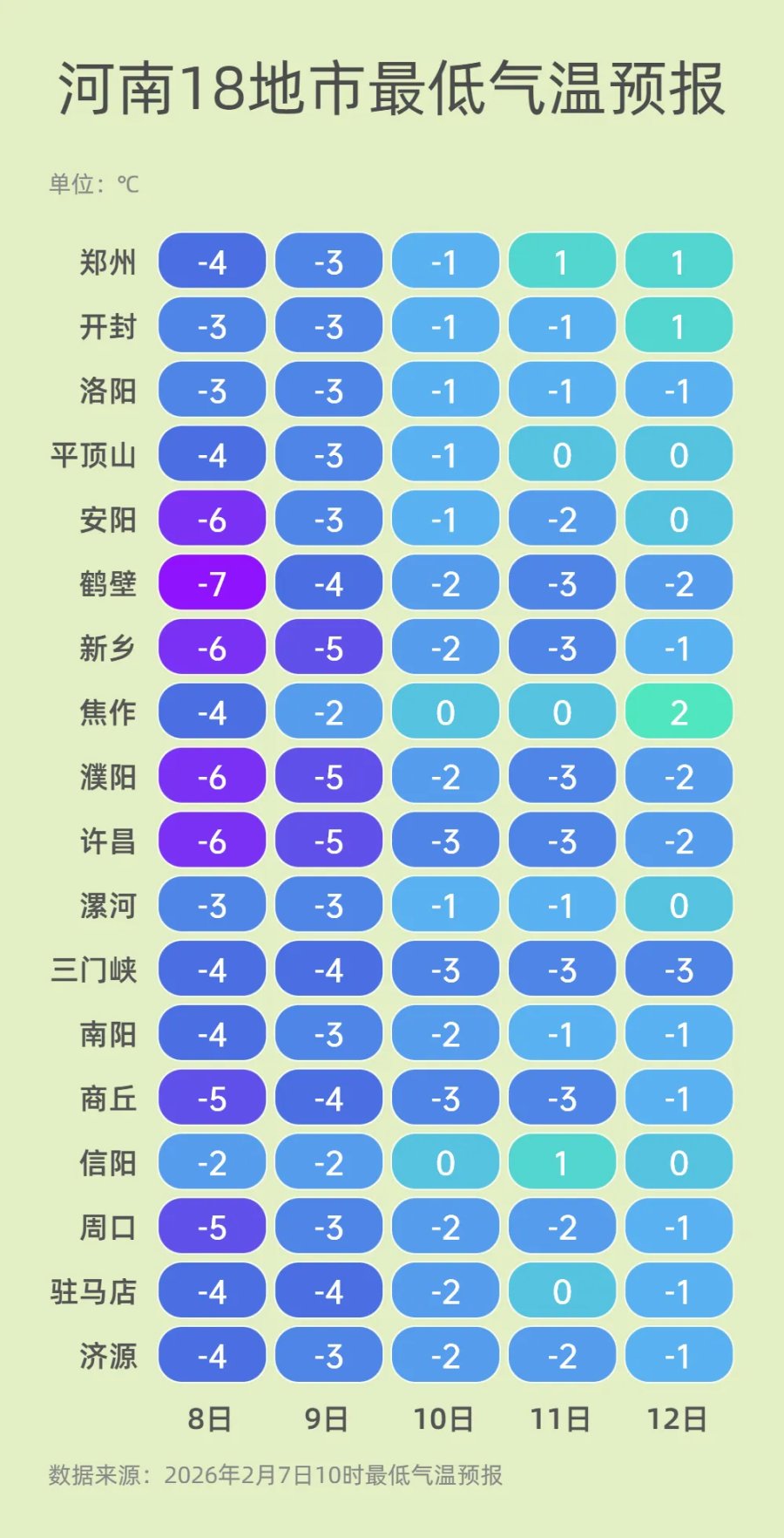昨夜到今晨,最低气温北部零下11度到零下8度,东南部0度左右,其他地区零下6度到零下3度。与前天早上(2026年2月5日7时)的温度相比,北部、中西部局部降温幅度超过10度,达到寒潮。