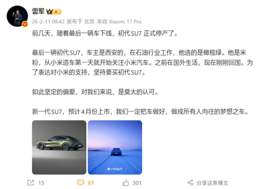 雷军小年夜亲手终结初代小米SU7