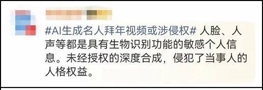 对此,网友们均表示了担忧:“技术创新需守规矩,版权伦理不容忽视。”“用AI还是要合法。”“AI拜年虽有趣,但也要注意法律边界,尊重他人权益!”