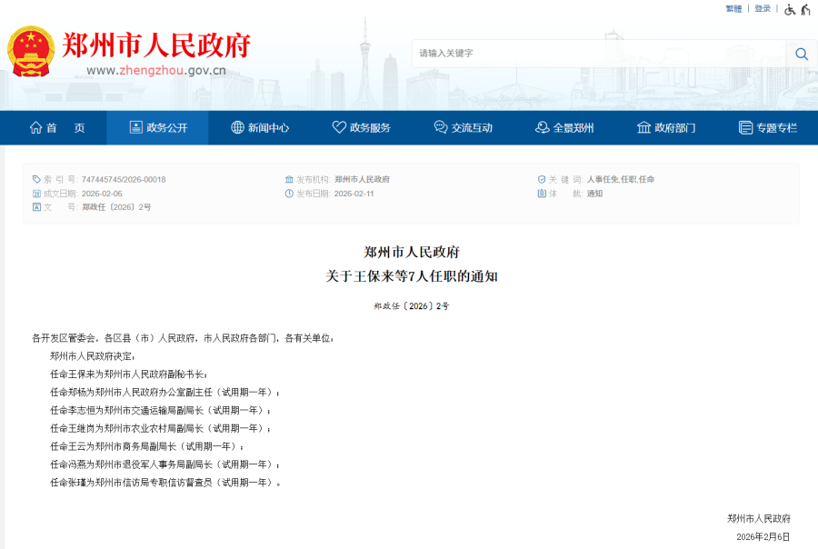 郑州市人民政府关于王保来等7人任职的通知