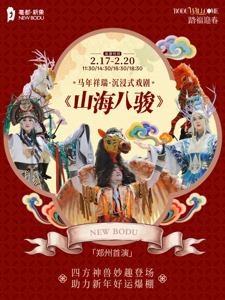 更具视觉冲击力的神话故事巡游将从大年初一持续到初四。取材自《山海经》的“山海八骏”沉浸式戏剧将于2月17日(春节)至20日(初四)每日四度登场(11:30、14:30、16:30、18:30)。掌管好运的毕方、聆听心愿的天马、驱散烦恼的驺吾、加持学业的龙马、歌生福禄的鹿蜀、守护和平的英招、兆示丰穰的当康……这些源自古老典籍的神兽将被赋予鲜活的形象与性格,巡游于人群之间。观众可以与他们互动、合影,接收一份来自神话世界的专属祝福。