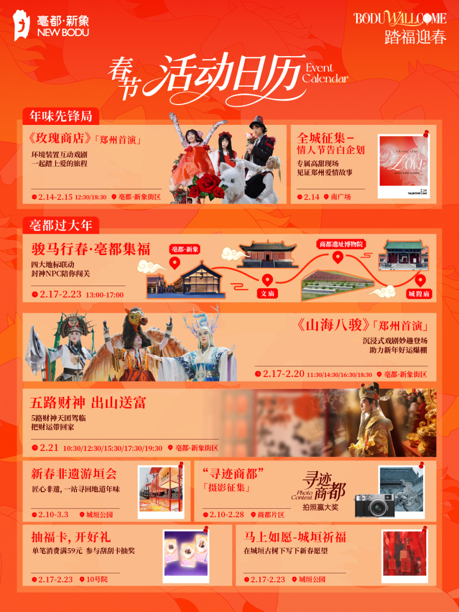 坐落于郑州老城核心,与文庙、城隍庙为邻,亳都·新象不仅自诞生起便肩负着衔接历史文脉与当代生活的使命,更在这个春节主动“攒局”,将规划落地为一场可亲身参与的新春盛事:大年初一至初七,市民游客可遍访四地、集章纳福,用一次出行收获可玩、可逛、可涨知识、可纳吉祥的丰富体验。而亳都·新象街区本身,也将在2月10日(小年)至3月3日(元宵节)期间,以“踏福迎春”为主题,推出一系列兼具传统韵味与创意体验的新春活动,为市民提供春节出行的新选择。