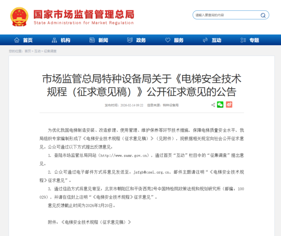 为优化我国电梯制造安装、改造修理、使用管理、维护保养等环节技术措施,保障电梯质量安全水平,我局组织专家编制形成了《电梯安全技术规程(征求意见稿)》(见附件),现根据相关规定向社会公开征求意见。公众可通过以下方式提出反馈意见: