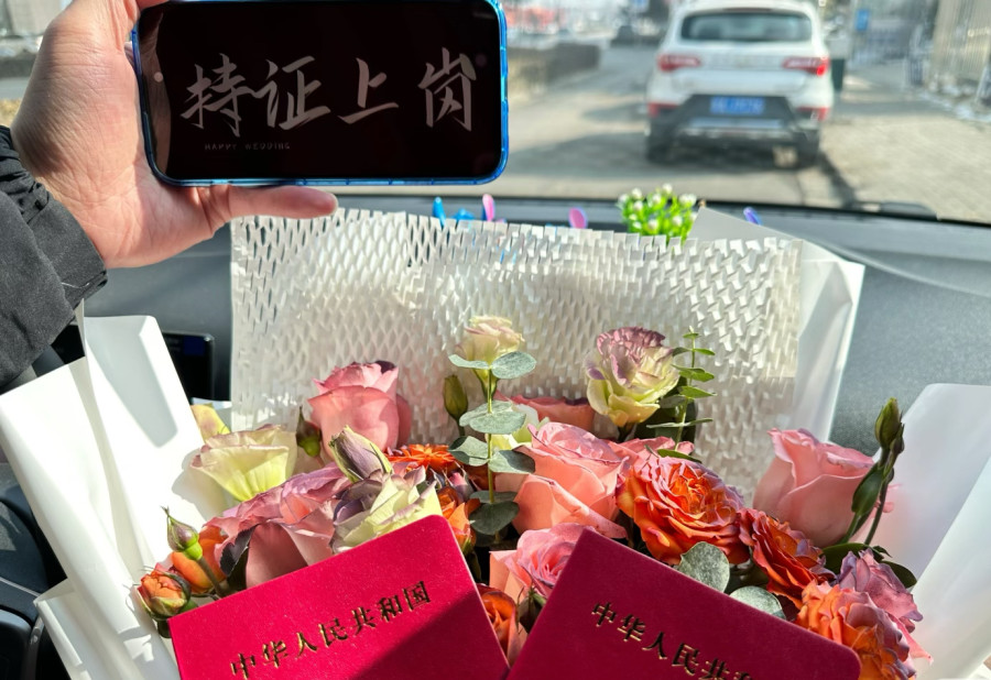 刚领完证的新人手捧鲜花,满脸笑意地说:“一进门就收到鲜花,特别惊喜,这个情人节和春节,因为这份仪式感变得格外有意义。”