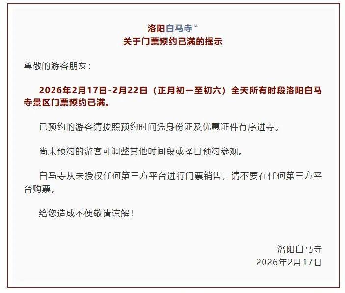 2月17日至2月22日(正月初一至初六)全天所有时段洛阳白马寺景区门票预约已满。已预约的游客请按照预约时间凭身份证及优惠证件有序进寺。尚未预约的游客可调整其他时间段或择日预约参观。