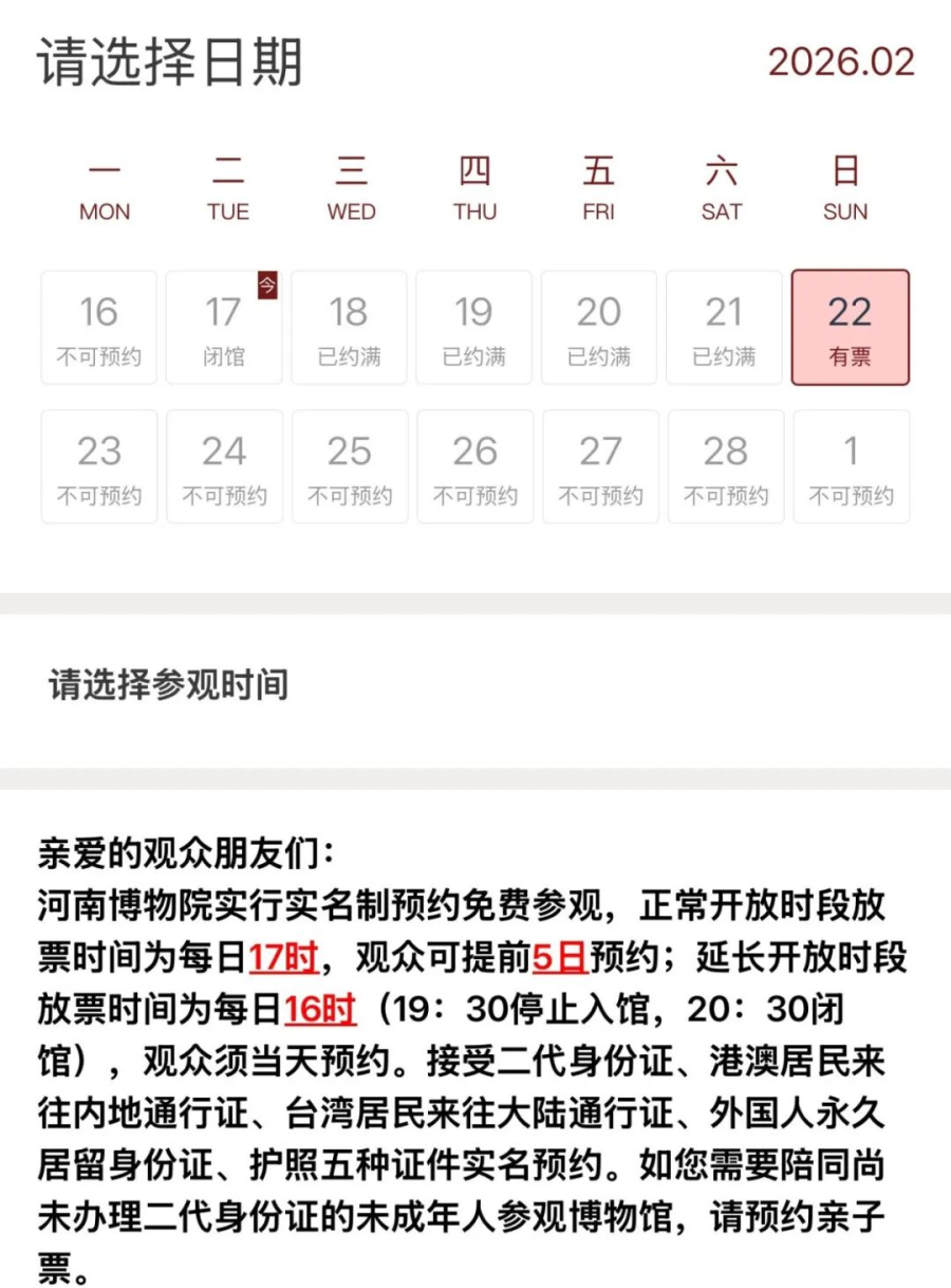 洛阳博物馆2月18日、2月19日门票预约已满,已预约的游客请按照预约时段有序进馆。尚未预约门票的游客可调整其他行程或择日预约参观。