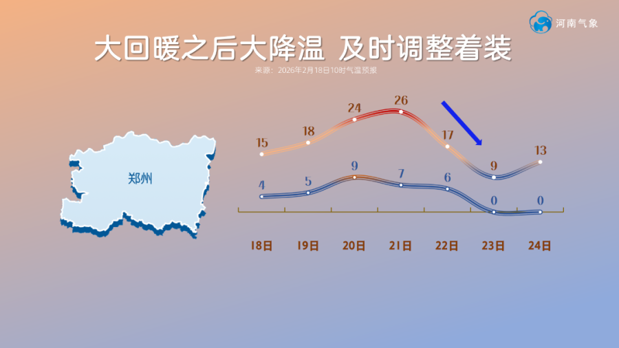 22日开始气温逐渐下降,预计23日是本轮过程最高气温的最低点,全省最高气温降至个位数。比如郑州,今后七天最高气温经历了大起大落,最高点(21日26℃)和最低点(23日9℃)相差17℃。24-25日早晨我省大部地区最低气温也将降至冰点或以下。气温变化剧烈,23日是春节假期的最后一天,公众出行需及时添衣,谨防感冒。