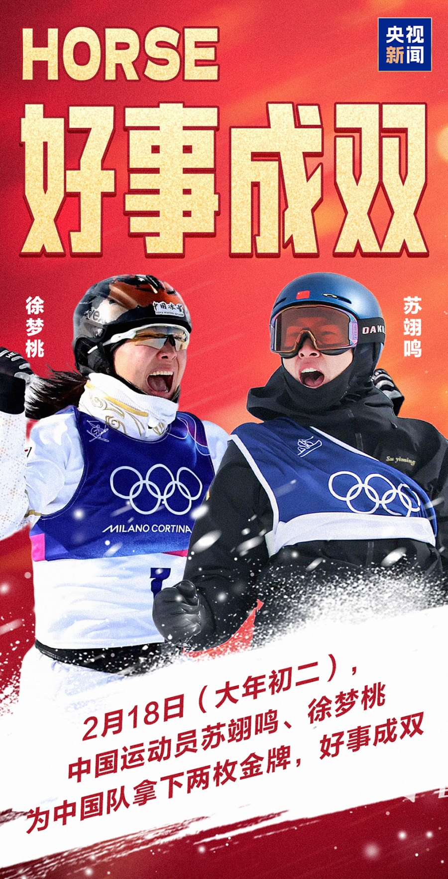 北京时间2月18日,在米兰-科尔蒂纳冬奥会上,中国选手苏翊鸣、徐梦桃分别夺得单板滑雪男子坡面障碍技巧、自由式滑雪女子空中技巧金牌。中国队一天内收获两枚金牌,五星红旗两次在赛场升起,点燃无数中国人的激情。