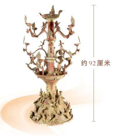 细看此灯:最上部灯盏以朱雀赋形,雀首引颈高昂,双翼赳立,尾羽束敛,将灯盏缀饰为四瓣花状;中间的灯柱呈竹节状,象征古代神话中的通天神柱,分3层插接12支曲枝灯盏,每层4枝从灯柱中虬奇生出,错落有致。曲枝近柱处各端坐一位羽人,背生双翼,神情肃然。灯柱下端塑一圆盘,与上端顶盘呼应,4条龙首自盘中蜿蜒伸展;最下部灯座呈覆钵形,钵的表面为3层嵯峨递缩的雄伟山峦,象征着古人信仰的昆仑仙山。