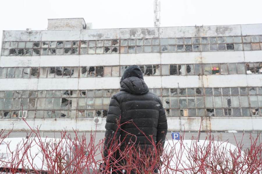 2026年1月9日,一男子在乌克兰首都基辅市第聂伯区查看空袭中受损的建筑。