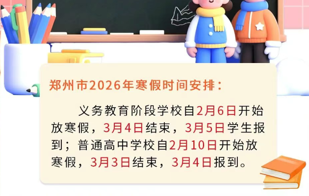 根据郑州市教育官方最新消息,郑州市2026年寒假时间安排,义务教育阶段学校自2月6日开始放寒假,3月4日结束,3月5日学生报到。普通高中学校自2月10日开始放寒假,3月3日结束,3月4日报到。