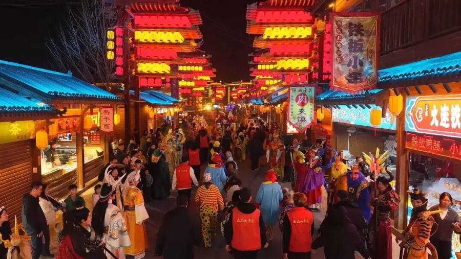 开封的城墙新春灯会,晚上十点还排长队;浚县古城夜里灯火通明,小吃摊前排满了人。