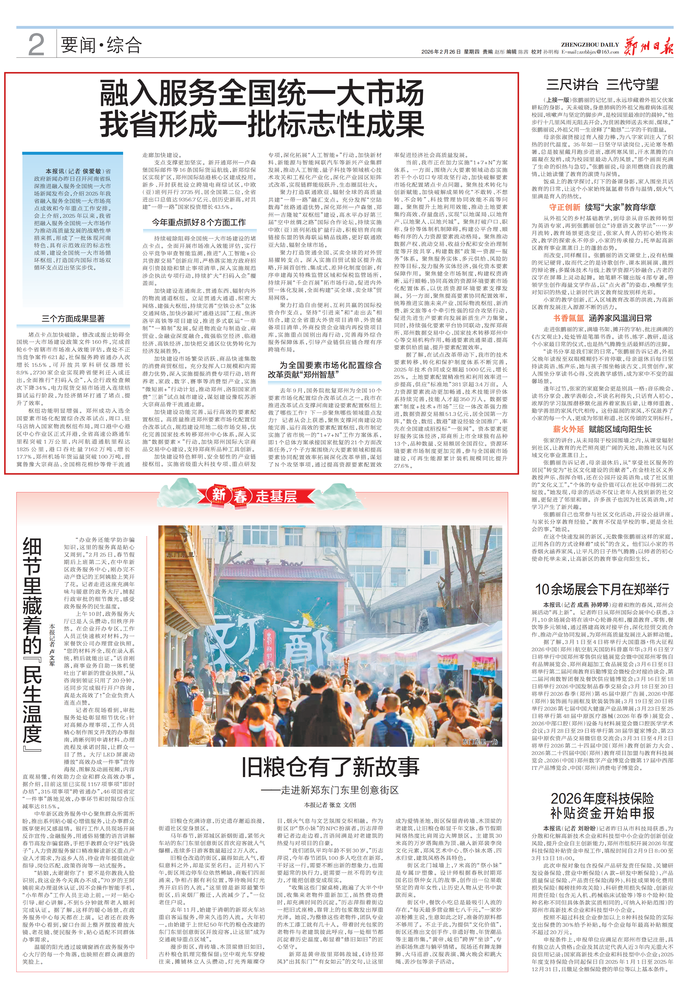 据了解,在试点改革带动下,我市的技术要素转移、转化和保护制度体系不断完善,2025年技术合同成交额超1000亿元,增长25%。土地要素配置精准性和利用效率进一步提高,供应“标准地”381宗超3.4万亩。人力资源要素流动更加畅通,技术技能评价体系持续完善,技能人才超350万人。数据要素“制度+技术+市场”三位一体改革强力推进,数据资源交易额51.3亿元,居全国第一方阵,“数仓、数纽、数港”建设经验全国推广,率先在全国建成招投标“一张网”。资本要素更好服务实体经济,郑商所上市全球独有品种13个,品种数量、交易额居全国首位。资源环境要素市场制度更加完善,参与全国碳市场建设,可再生能源累计装机规模同比提升27.6%。