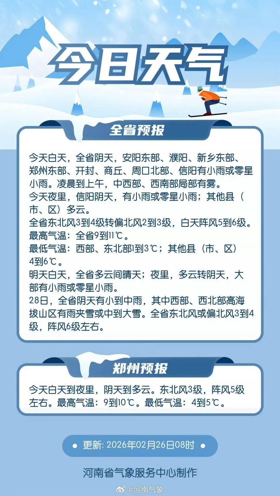 今天是2月26日,回顾昨天夜里,全省大部分地区都经历了小雨,南阳东部、驻马店南部和信阳局部雨势较强,达到了中雨级别。湿冷的空气正逐步渗透进城市的街巷。