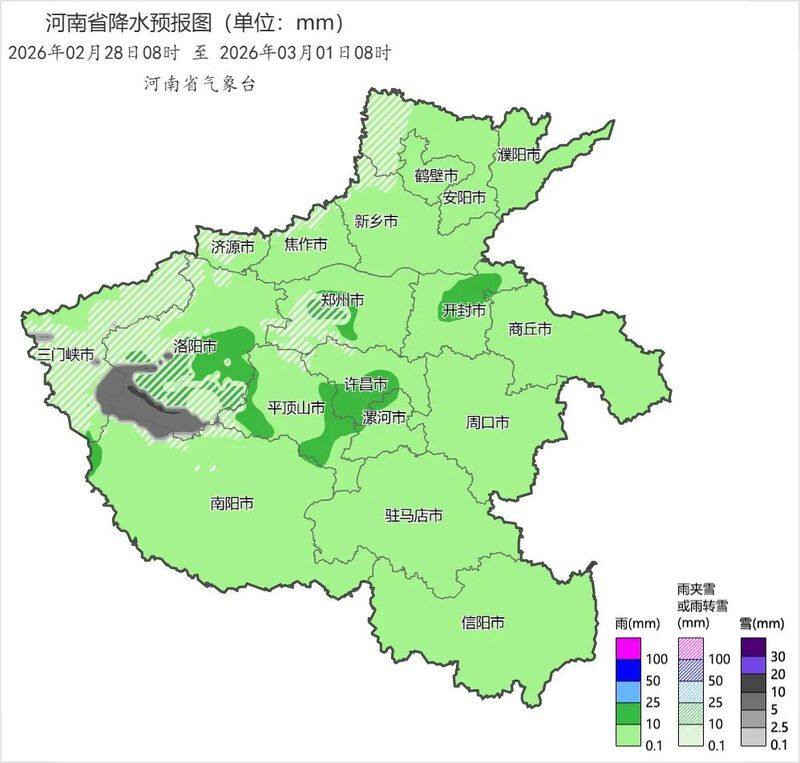 河南省气象台2026年2月28日17时发布暴雪蓝色预警:预计3月1日08时至3月2日08时,安阳、鹤壁、新乡、濮阳西部、焦作北部、济源西部和北部、三门峡、洛阳、郑州中西部、许昌西部、平顶山西部、南阳西北部将出现5毫米以上降雪,其中安阳中西部、鹤壁北部、三门峡东部、洛阳西部和南部、郑州西南部部分县(市、区)将出现10毫米以上降雪,请注意防范。上述地区的相邻县(市、区)也需关注。