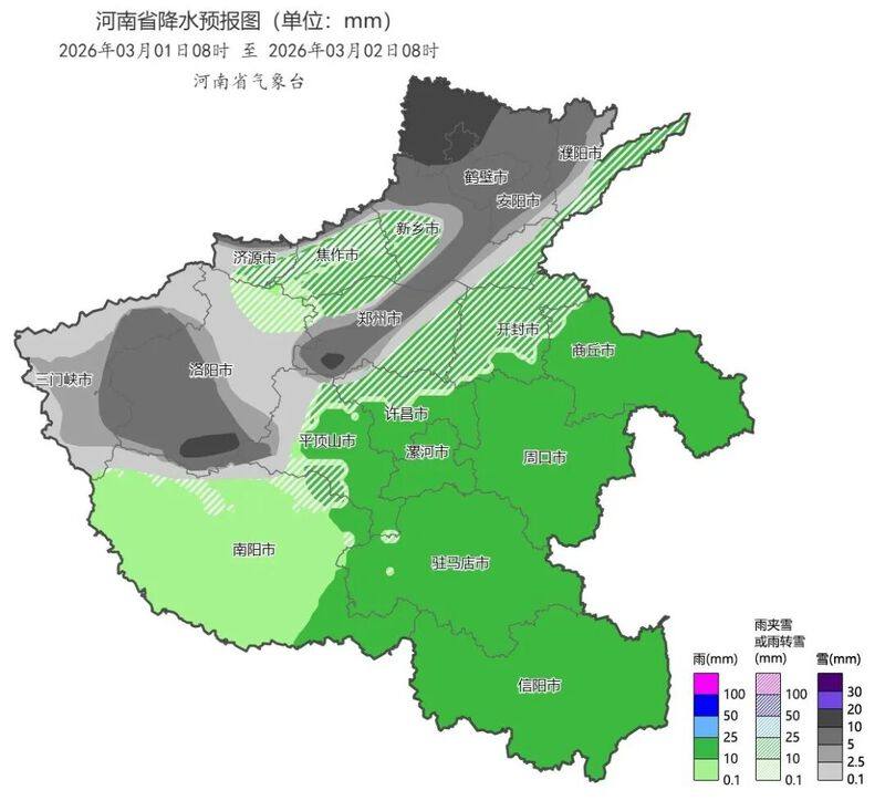 随着暖湿气流将水汽源源不断向河南输送,今明两天雨雪的范围将逐步覆盖到全省。具体来看,今天的雨雪相对较弱,河南大部以小雨为主,西部、西北部部分县市会逐渐转为雨夹雪或小到中雪;明天(3月1日)将进入本轮雨雪的最强时段,全省大部将下起小到中雨,气温较低的西部、北中部会有更多地区由雨转为雨夹雪或小到中雪,尤其是豫北、豫西以及郑州西部部分县市将出现大到暴雪。