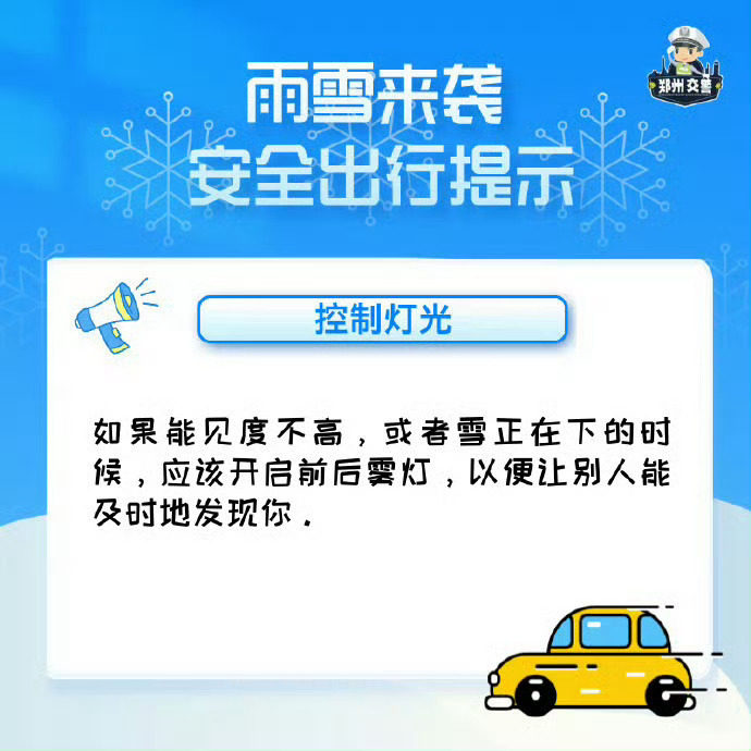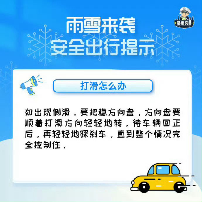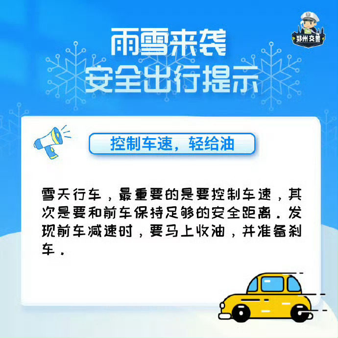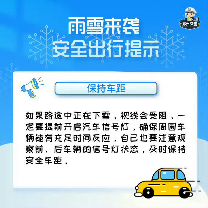 ✅ 机动车:减速慢行,保持车距,避免急刹急转,谨慎通过易滑路段;