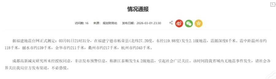 成都高新减灾研究所未经授权同意,非法发布预警信息,称浙江泰顺发生4.2级地震,引起社会广泛关注。该时间段浙江省域内无地震事件发生,请社会各界关注该局官方发布渠道,不必恐慌。
