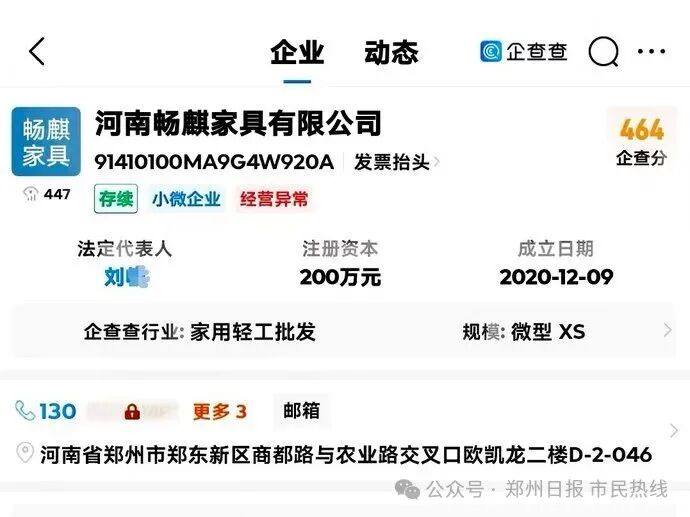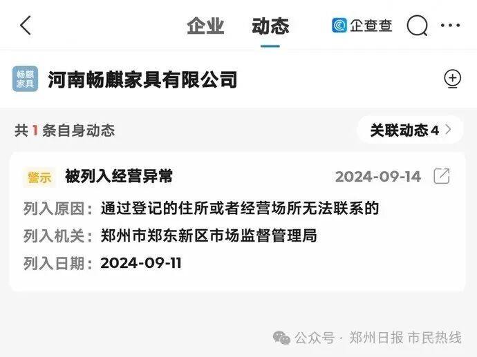 在企业信息查询软件上,赵女士所说的河南畅麒家具有限公司地址显示为商都路与农业路交叉口欧凯龙二楼某门牌号,法定代表人即为刘某,状态则被红色标注“经营异常”,而被郑东新区市场监督管理局列入经营异常的原因则早在“2024年9月14日”。