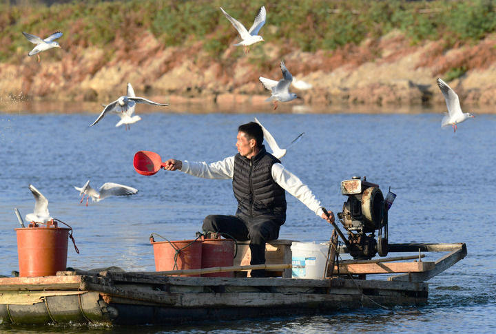 2025年12月10日,福建省漳州市佛昙镇东坂村河豚养殖户在给河豚投喂食物。