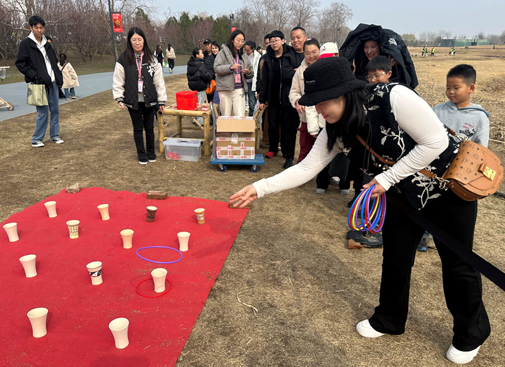 作为系列活动的“人气担当”,“大河园游会”于3月3日下午在公园入口处欢乐开场。活动以民俗游戏打卡集章为核心,设置了套圈、投壶、猜灯谜三大经典项目。参与者每成功完成一项挑战,即可获得一枚专属贴纸。集章打卡的趣味形式吸引了众多家庭与游客踊跃参与,现场欢声笑语不断。