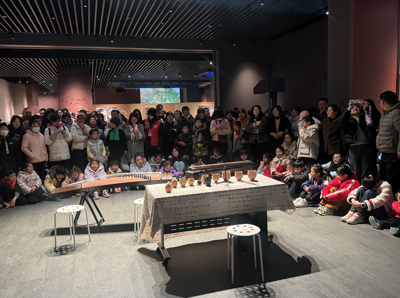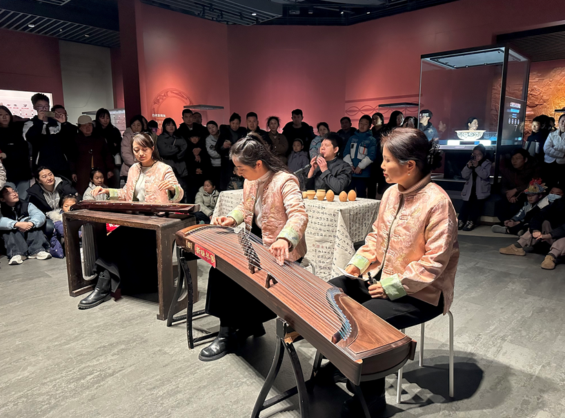 3月3日上午,一场别开生面的“陶韵千年·今宵乐动”音乐快闪在遗址博物馆展厅内的镇馆之宝——白衣彩陶盆旁奏响。古琴、古筝、古埙、陶铃等传统乐器联袂登场,依次演绎了《半山听雨》《关山月》《归来》《我和你》等曲目。短短二十分钟,空灵悠远的旋律在静谧的展厅中流淌,串联起静心沉淀、家国情怀、团圆归心与天地人和的情感脉络,为节日增添了一抹深邃雅致的古韵。演出吸引了大量观众驻足聆听。不少观众表示,在珍贵文物旁聆听穿越千年的古老音色,仿佛完成了一场与仰韶先民的直接对话,这种沉浸式的文化体验新颖而震撼。