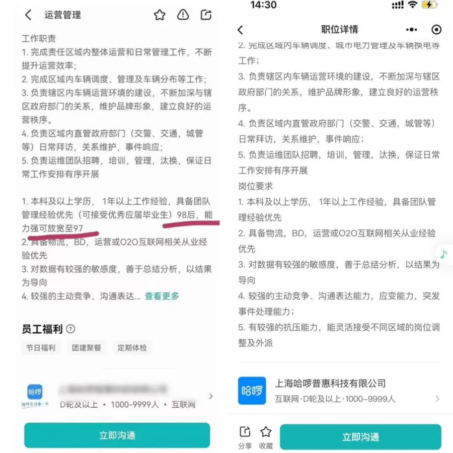 近日,有网友反映哈啰在Boss直聘上发布运营管理岗位的招聘通知,要求应聘者出生年份在1998年后,即不超过28岁,并称若有能力可以将年龄限制放宽至29岁。招聘页面显示,该岗位负责区域内整体运营和日常管理工作、完成区域内车辆调度、管理及车辆分布等工作。