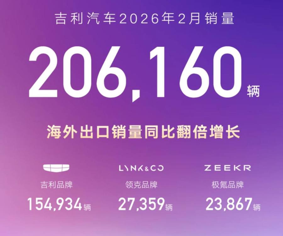 吉利能在市场淡季稳住这一大关,主要得益于旗下极氪和领克两大品牌的强势爆发。其中,极氪品牌2月销量达2.39万辆,同比大涨70%,实现同环比双增长;领克品牌同样表现抢眼,销量达2.74万辆,同比增长59%。此外,燃油车板块的中国星系列也“出力”不少,2月销量达到8.18万辆,证明传统燃油车依然有其市场空间。