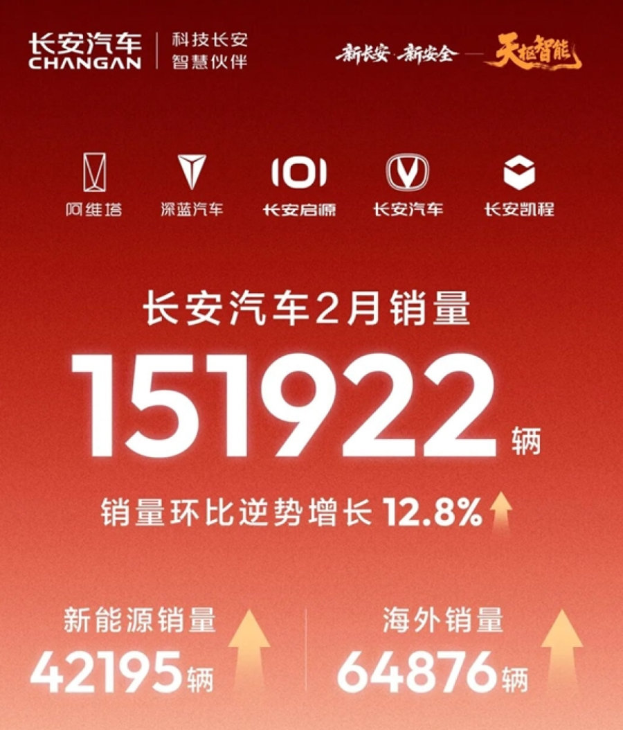 长安汽车2月销量为15.19万辆,环比增长12.8%,成为为数不多实现环比正增长的车企。其中,新能源销量4.22万辆,海外销量6.49万辆。分品牌看,长安品牌售出5.97万辆,环比增长41.6%,旗下逸动系列更是荣膺“2025年中国自主燃油轿车销量冠军”;长安启源售出1.83万辆,环比大涨96.3%。