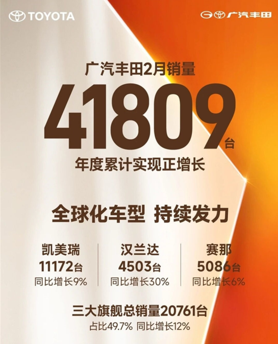 在已公布数据的合资品牌中,广汽丰田2月销量为4.18万辆,年度累计实现正增长。其中,凯美瑞、汉兰达、赛那三大旗舰车型贡献了近一半的销量,总计2.08万辆,占总销量的49.7%,同比增长12%。具体来看,凯美瑞销量1.12万辆,同比增长9%;汉兰达销量4503辆,同比增长30%;赛那销量5086辆,同比增长6%。