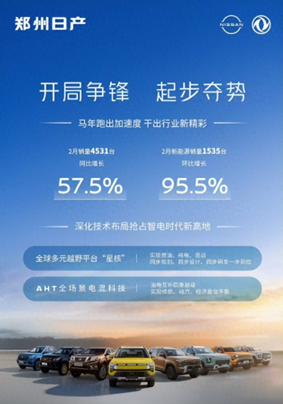 一直保持低调的郑州日产在3月首日公布了其2月销量——4531辆,同比增长57.5%,其中新能源车销量为1535辆,环比增长95.5%。