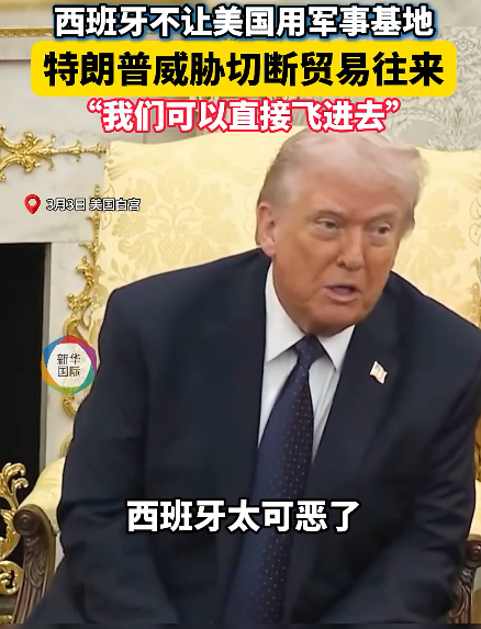 特朗普当天在白宫会见到访的德国总理默茨时说,西班牙不同意将军费增至国内生产总值5%的北约目标,而且在此次美国打击伊朗的军事行动中,西班牙拒绝美国使用其军事基地,西班牙“态度不友好”。特朗普威胁称,“我们打算切断与西班牙的所有贸易往来,我们不想和西班牙有任何瓜葛”。