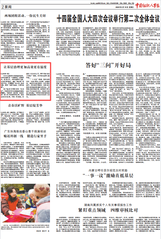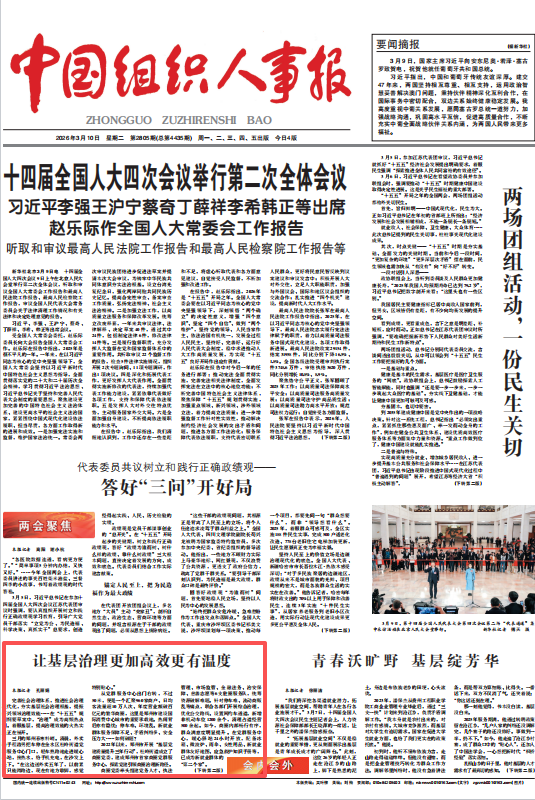 2026年3月10日,《中国组织人事报》第1版、2版刊发文章《让基层治理更加高效更有温度》,着眼郑州基层治理、提高治理效能的火热实践。