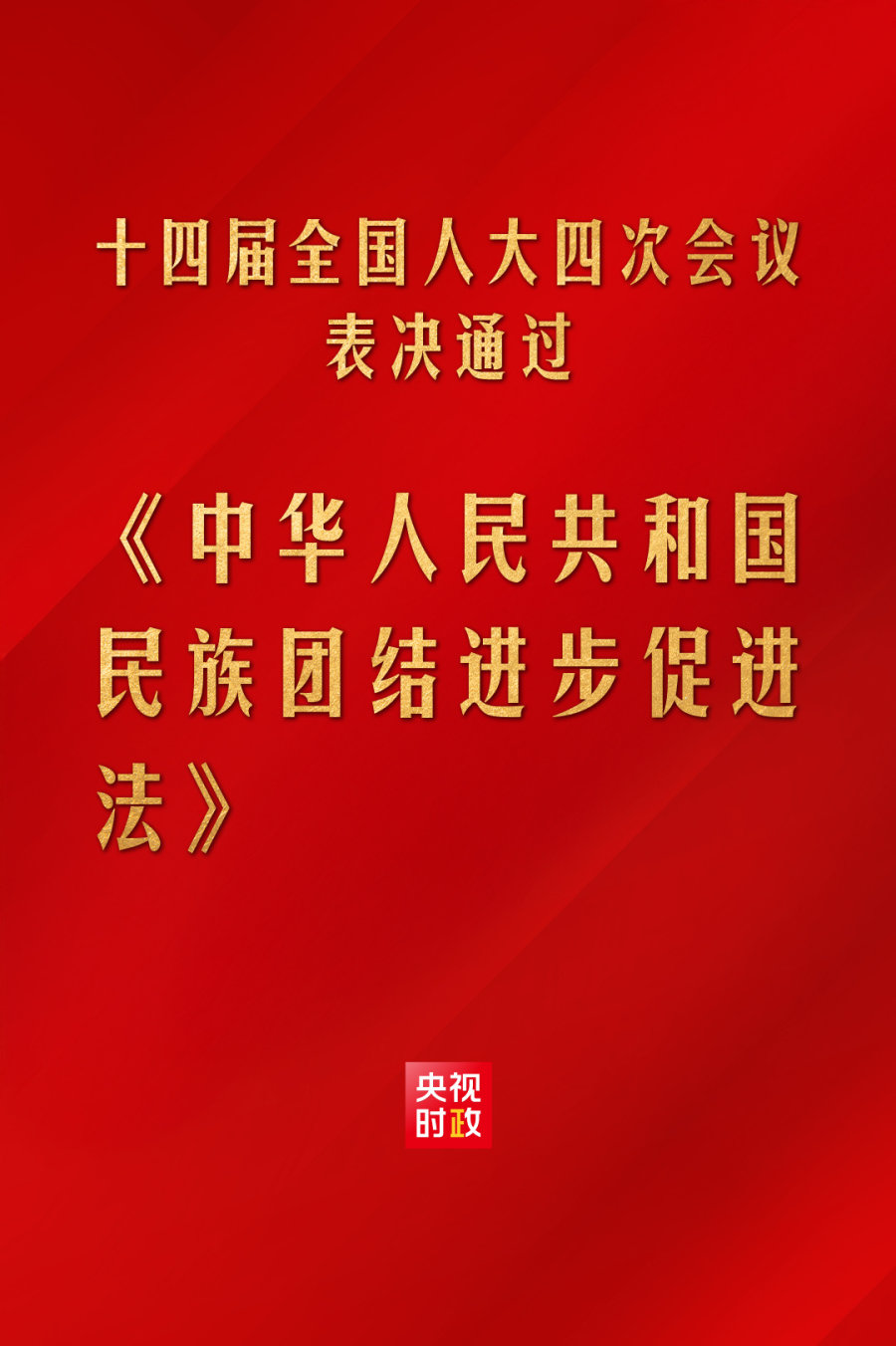 十四届全国人大四次会议表决通过《中华人民共和国民族团结进步促进法》。