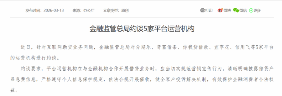 近日,针对互联网助贷业务问题,金融监管总局对分期乐、奇富借条、你我贷借款、宜享花、信用飞等5家平台的运营机构进行约谈。