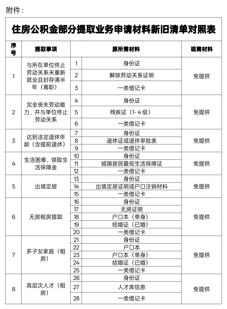 意见主要内容为,公积金缴存职工在线下办理公积金部分提取业务时,凡相关信息可通过数据共享核验的,免于提交相应纸质材料。具体可办业务范围及申请材料减免清单,详见《住房公积金提取业务申请材料新旧清单对照表》。