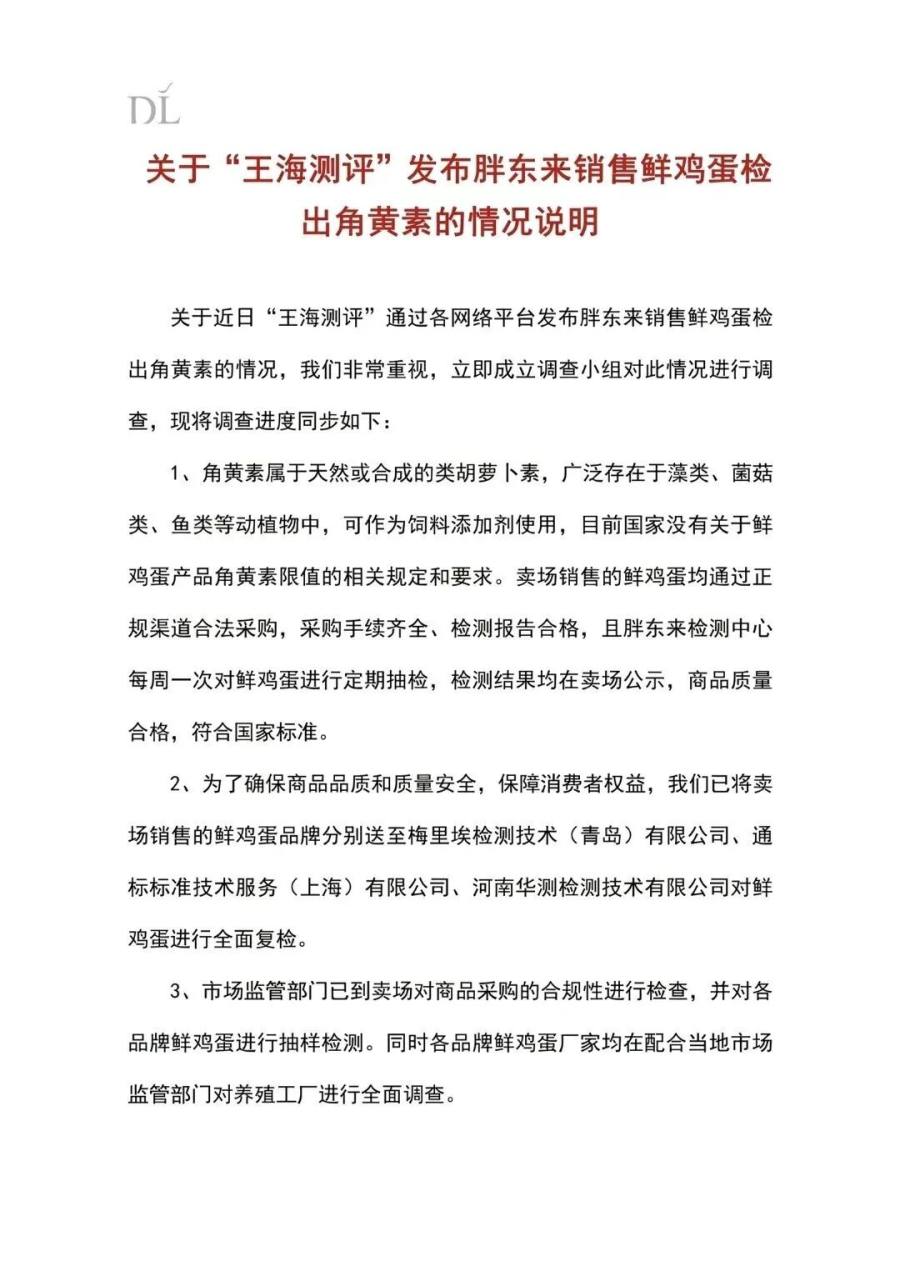 目前市场监管部门的相关调查以及第三方复检还未出结果,如果最终的调查结果显示鲜鸡蛋存在问题,会第一时间公示结果,并立即启动下架召回程序,依法承担相应法律责任。如果没有问题,胖东来也将坚决依法诉讼维权,追究此次事件中个人、自媒体、平台的法律责任。