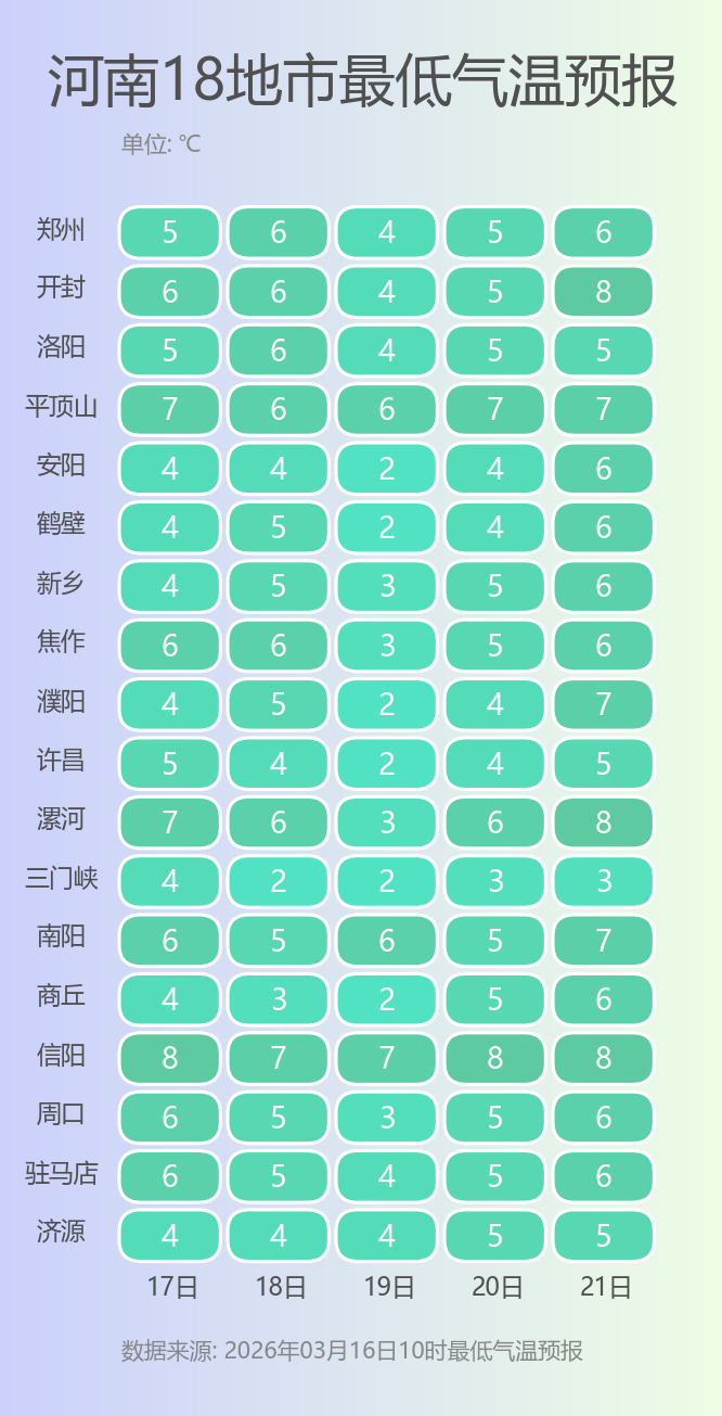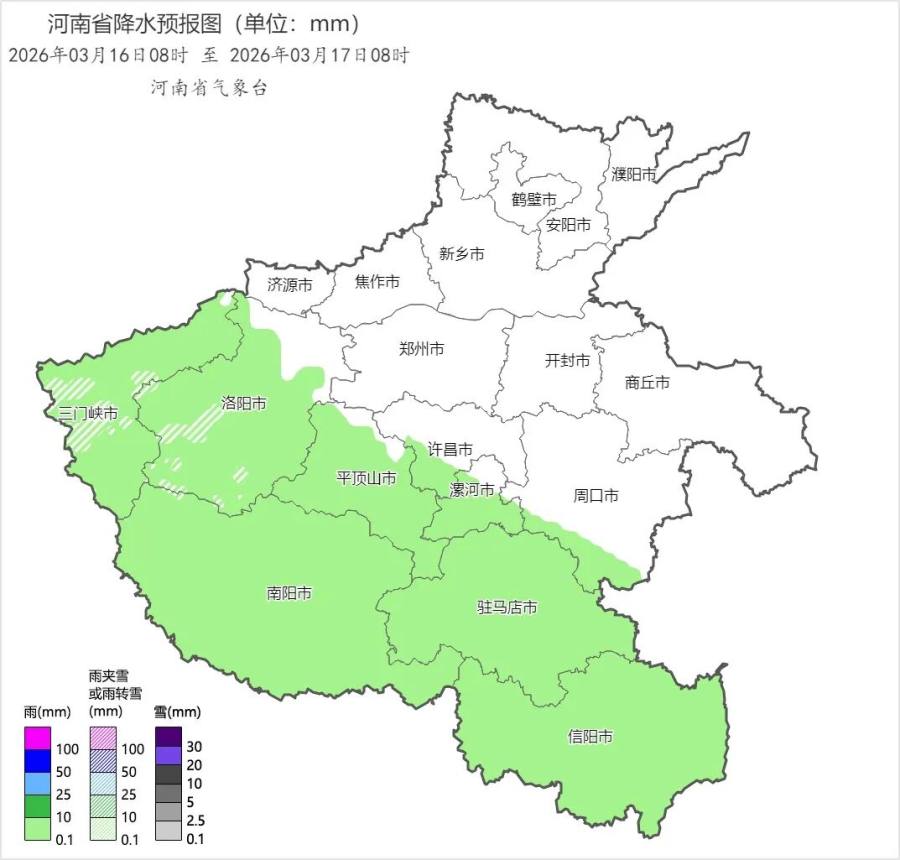 今天夜里,三门峡、洛阳、平顶山、许昌南部、漯河、驻马店、南阳、信阳阴天转小雨或零星小雨,西部高海拔山区有雨夹雪;其他县(市、区)多云转阴天。北部局部有雾。