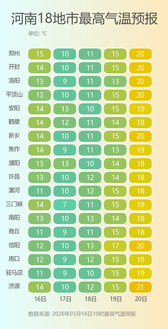与此同时气温也将短暂下滑,预计明后两天多地最高气温降至10度左右,不过升温是本周的主旋律,20日多地最高气温接近20度,周末将进一步上升至20度以上,南部部分地区甚至有望冲上25度!提醒大家关注气温变化,及时增减衣物。