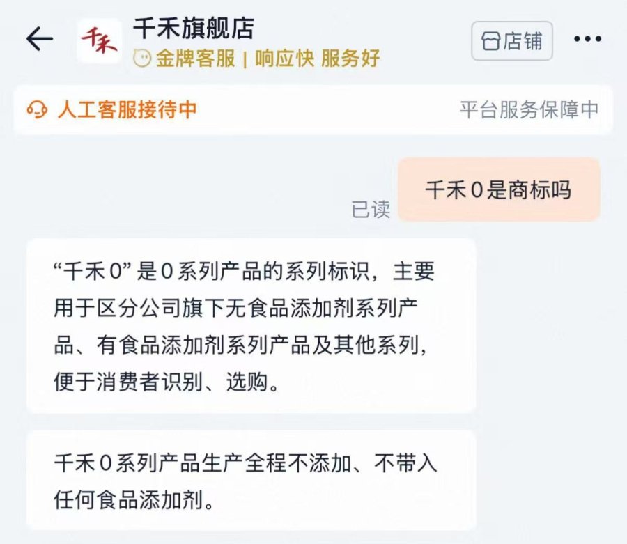 在电商平台,相关系列产品也在销售。针对“千禾0”是否为注册商标,记者询问了天猫平台千禾旗舰店,相关客服表示:“‘千禾0’是0系列产品的系列标识,主要用于区分公司旗下无食品添加剂系列产品、有食品添加剂系列产品及其他系列,便于消费者识别、选购。”