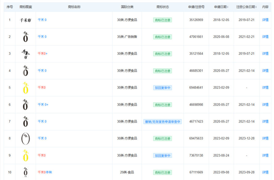 有关“千禾0”的商标信息 截图来自天眼查