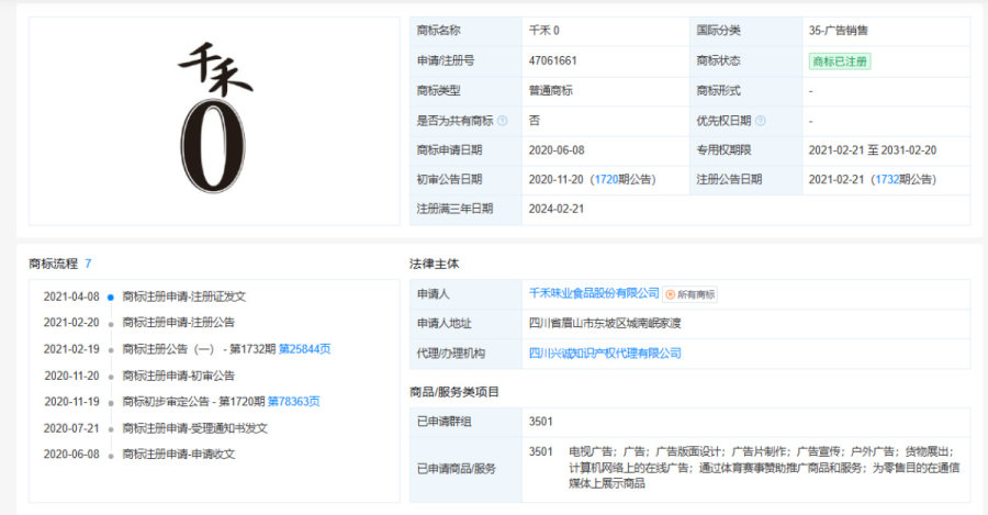 其核心商标“千禾0”,在2020年6月8日申请,2021年2月21日就已注册公告,专利使用期限为2021年2月21日至2031年2月20日。