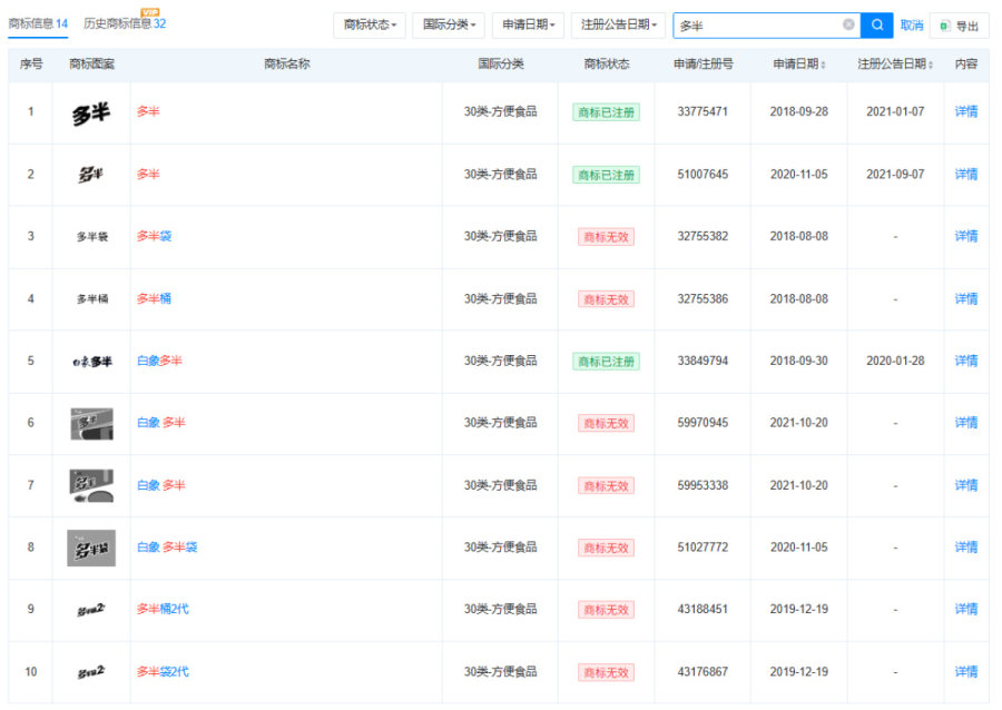 白象有关“多半”的商标信息 截图来自天眼查