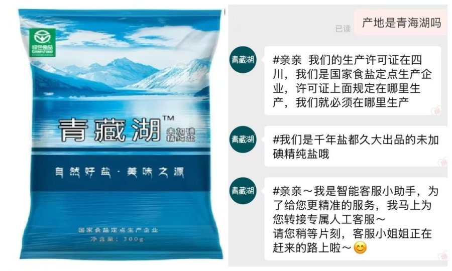 更有商家利用仅提交申请的TM标制造误导,如某平台销售的一款发货地在四川的“青藏湖盐”,包装标注“青藏湖”TM标,但当记者询问产地是否为青藏地区时,商家却顾左右而言他,无法证实产品与产地的关联。
