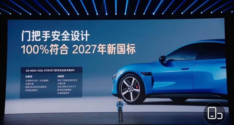 雷军表示,门把手安全设计100%符合2027年新国标。