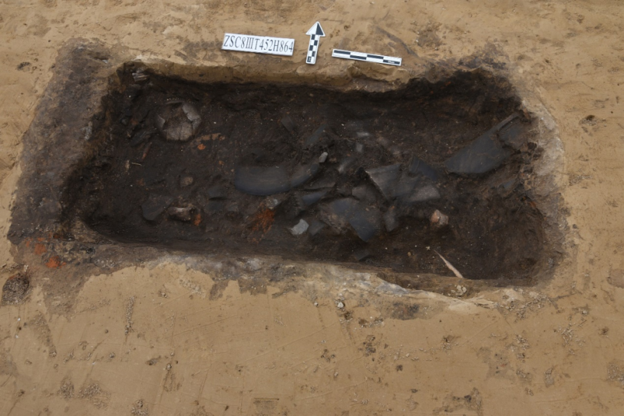 一处位于内城外西北部,为环壕与夯土墙合围的长方形大型祭祀区,东西宽约30米、南北长逾50米。中部设核心祭祀场,周围密集分布数十个祭祀坑,出土人骨、动物骨骼、卜骨、石刀等,祭祀区北部有成排夯土建筑基址。有学者认为,该遗存与文献记载的“庙、社、坛、坎”等祭祀形态密切相关。