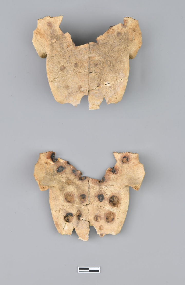 郑州商城西南部M47出土的兽面镶嵌器(右侧为复原)