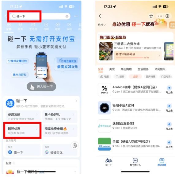 “以前付款要找付款码,现在手机碰一下就完成,还能自动减钱,太方便了!”,线下购物的黄女士表示;参加“碰友节”的商户也覆盖了众多场景,菜场、超市、便利店、水果茶饮店等等,市民在支付宝搜“碰一下”,即可查看附近支持使用的门店信息。